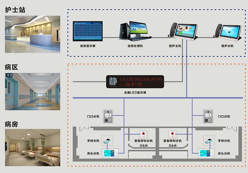 系統(tǒng)與醫(yī)院HIS系統(tǒng)對接,將患者信息、醫(yī)護人員信息顯示在護士站、病房門口機、病床分機等設備的顯示屏上,提高護理工作的自動化、數(shù)字化和人性化水平,實現(xiàn)醫(yī)院護理信息管理向病房延伸。